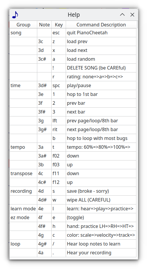 Here's the help menu for keyboard shortcuts (regular and piano)